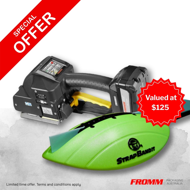 Purchase any FROMM battery strapping tool and receive a Strap Bandit at no extra cost